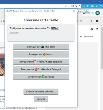 Save to Trello is een handige Firefox-extensie die gebruikers in staat stelt om eenvoudig Trello-kaarten aan te maken vanuit elke webpagina, inclusief webmail zoals Gmail. Deze tool bevordert een georganiseerde workflow door het mogelijk te maken om relevante content, zoals artikelen of e-mails, op te slaan voor latere toegang. De extensie is ideaal voor gebruikers die streven naar een 'Inbox Zero' benadering en hun taken efficiënt willen beheren.